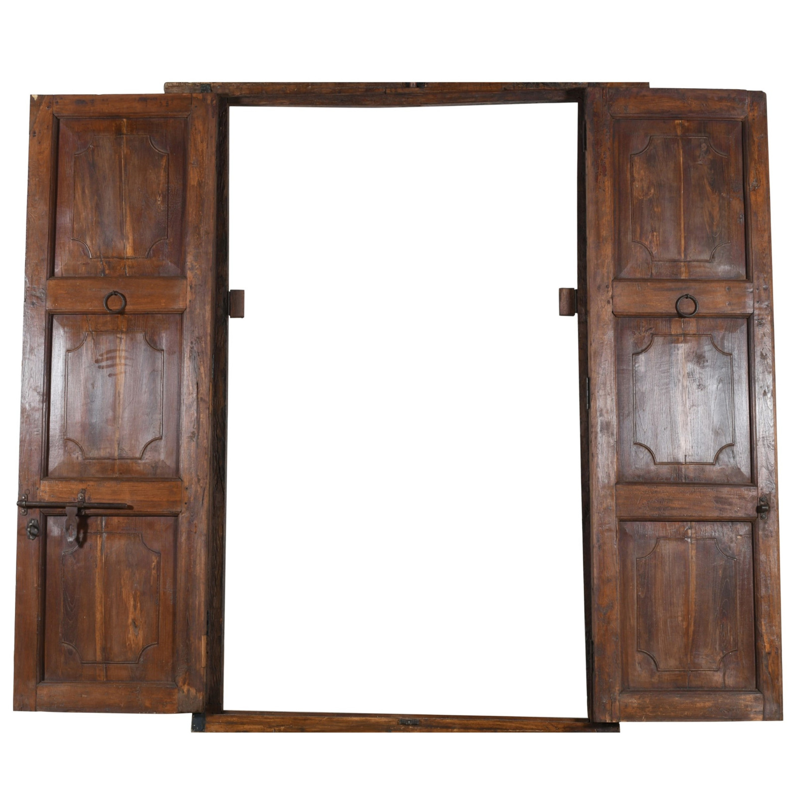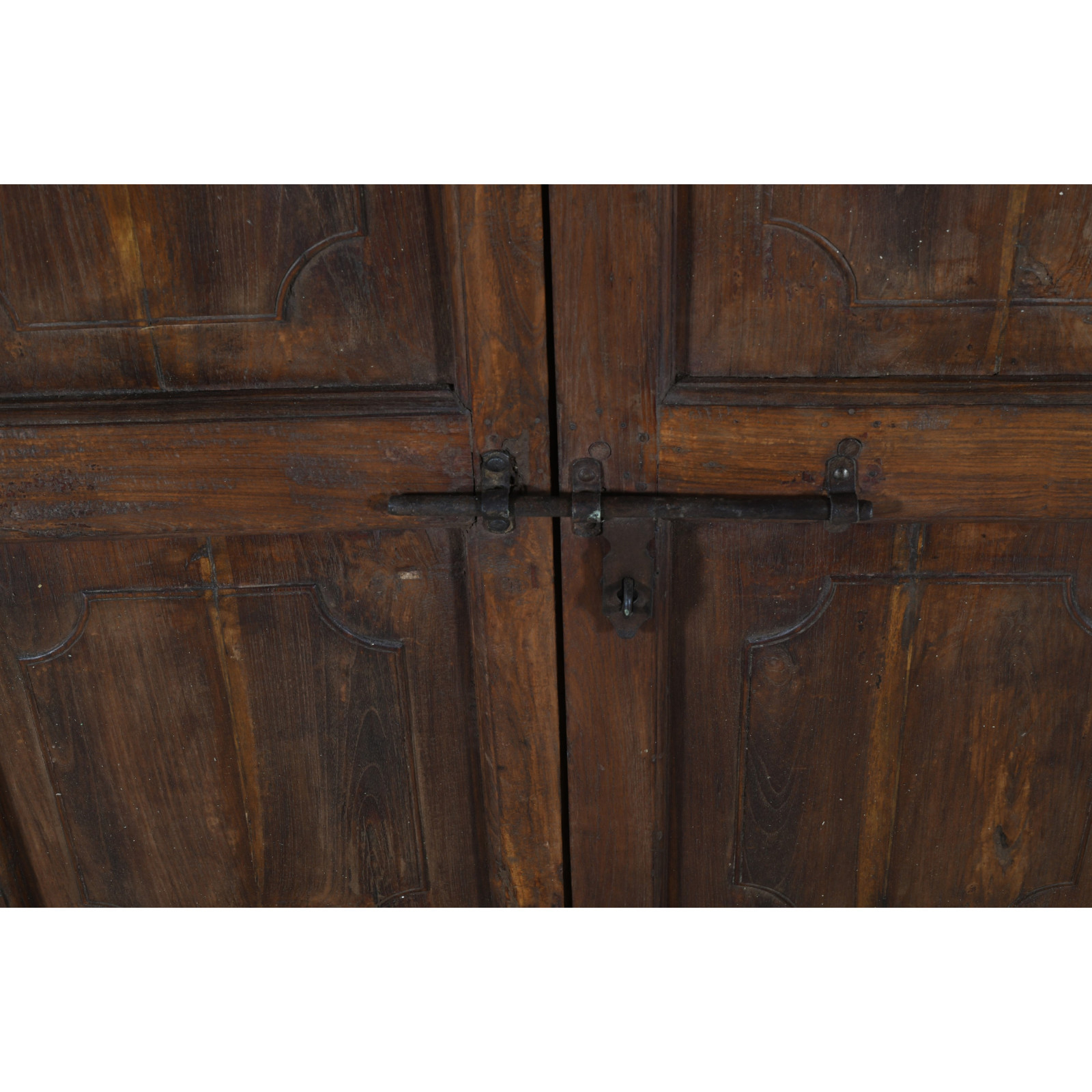 Oude deur/poort van massief teakhout met een lengte van 160 cm, een diepte van 10 cm en een hoogte van 214 cm. Deze deur is afkomstig uit sloopwerkzaamheden en restauraties van oude en belangrijke gebouwen. Elke deur is zorgvuldig gerestaureerd en behandeld voor gebruik buitenshuis en is een echt en uniek antiek stuk. Alle afmetingen hebben betrekking op de maximale afmetingen van het artikel.