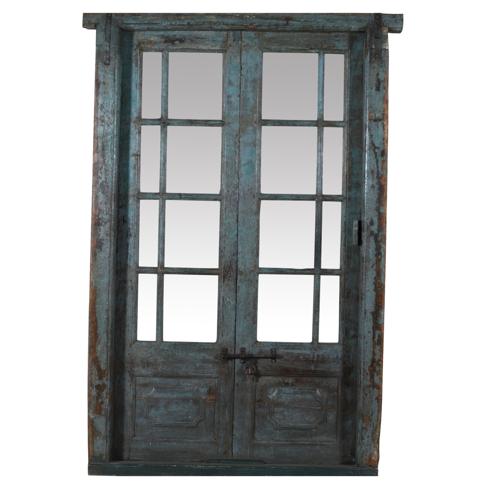 Oude, antieke middeleeuwse houten en ijzeren deur voor binnen- of buitengebruik met kozijn en glas