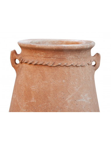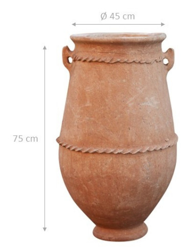Handgemaakte en houtgestookte vaas zoals in de oudheid met afmetingen van lengte 45 cm, diepte 45 cm, hoogte 75 cm. Het kan ook worden gebruikt als buitenpot voor planten en bloemen of als decoratieve binnenamfora. Oorspronkelijk gebruikt als datumcontainers. Onder de ambachtelijke tradities van Marokko wordt een prominente plaats ingenomen door de productie van terracotta vazen en amforen. De verwerkingsmethoden worden van generatie op generatie doorgegeven en zijn door de eeuwen heen bewaard gebleven. Omdat het handgemaakte items zijn, verschillende maten en kleurschakeringen, is elk item een uniek stuk.
