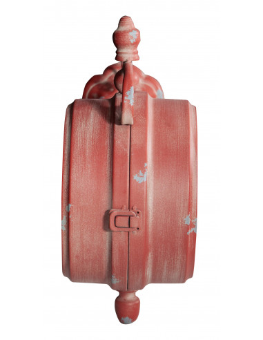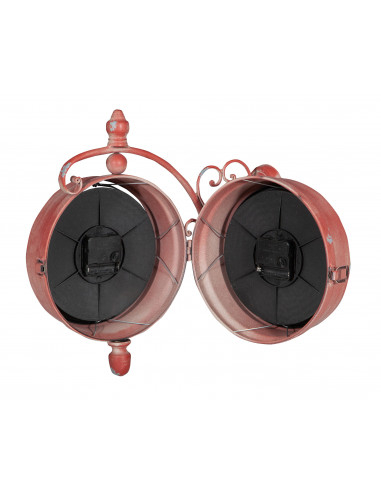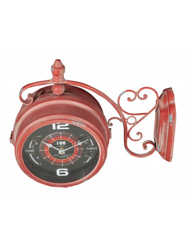 Dubbelzijdige wandklok met verouderde rode afwerking, maat 40 cm, diepte 16 cm, hoogte 38 cm met stabiele ijzeren steun. Het ontwerp doet denken aan oude stationsklokken. De twee draaiknoppen, gemakkelijk bereikbaar dankzij een scharnier, zijn onafhankelijk waardoor het ook mogelijk is om twee verschillende tijden te markeren. Originele aanvulling op vintage meubels voor elk type omgeving. Ook ideaal als wandwekker voor binnen en buiten, zoals veranda's, luifels, partytenten etc ...