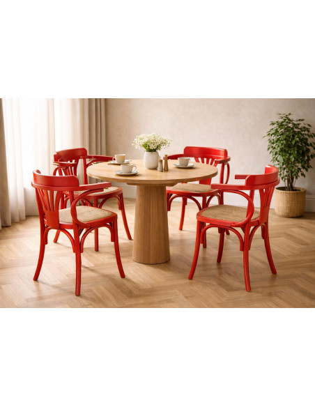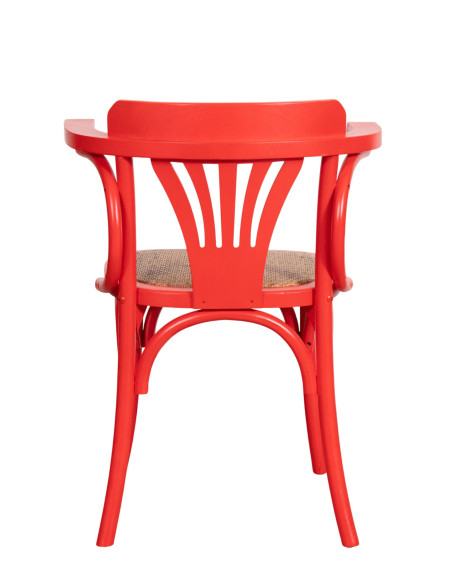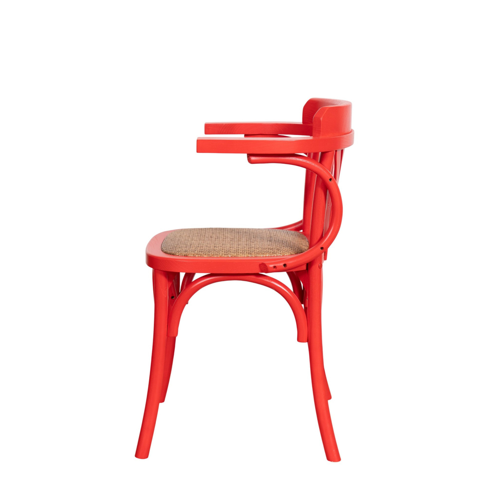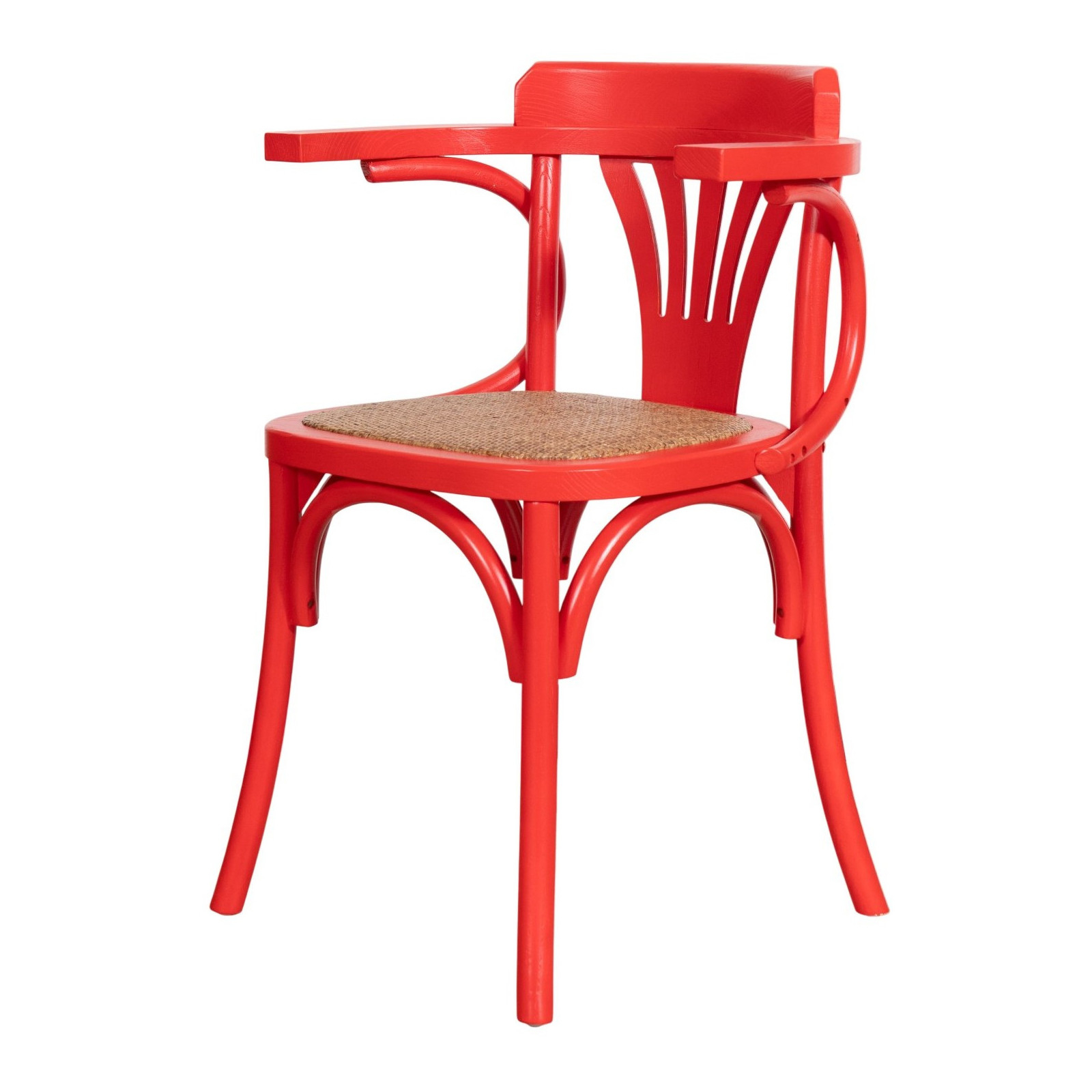 Stoel met armleuningen van Thonet, gemaakt van massief essenhout met rode afwerking en zitting van rotan