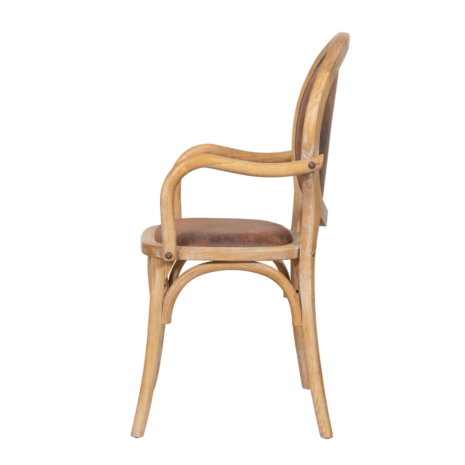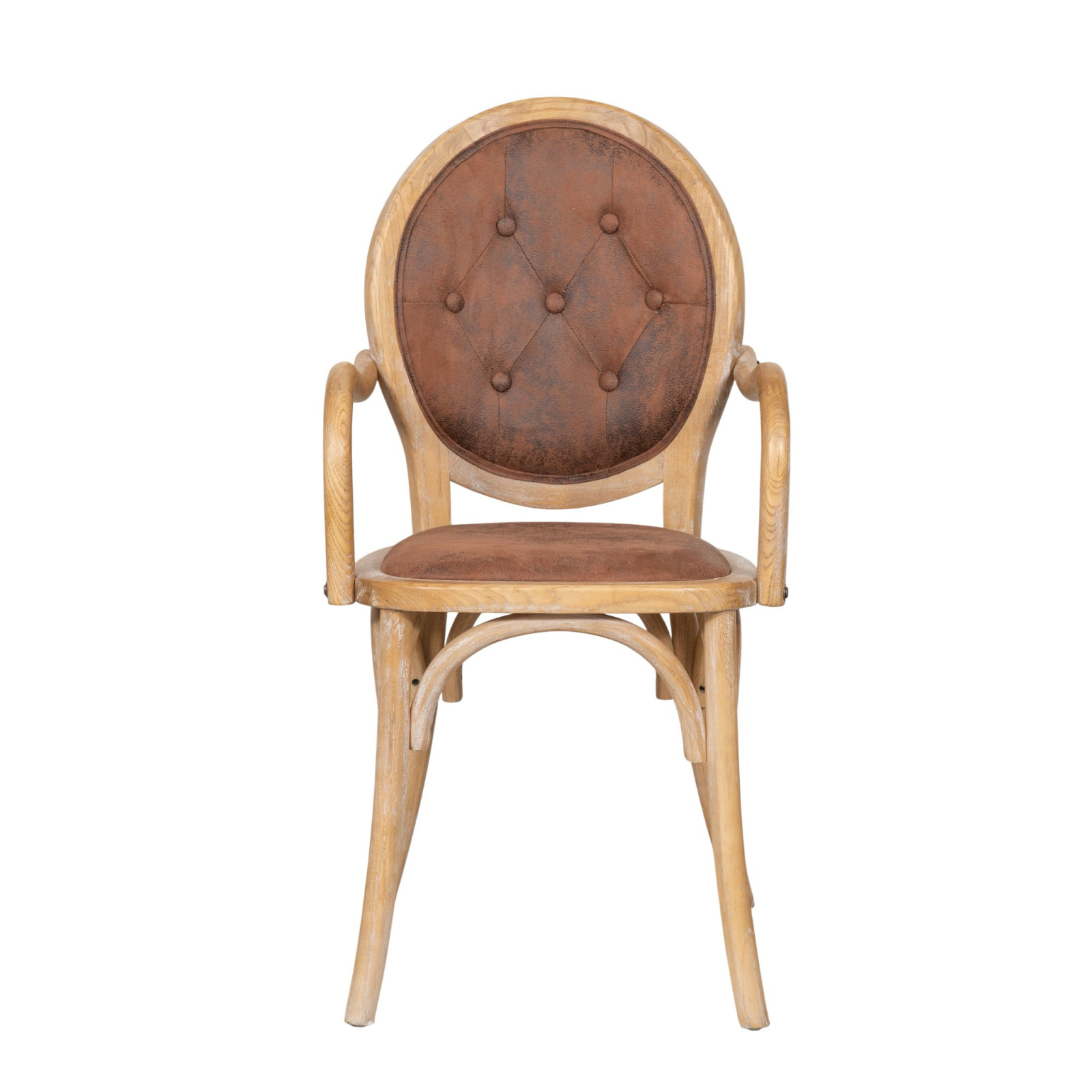 Stoel met massief houten armleuningen en een gewatteerde zitting in een lichte walnootafwerking