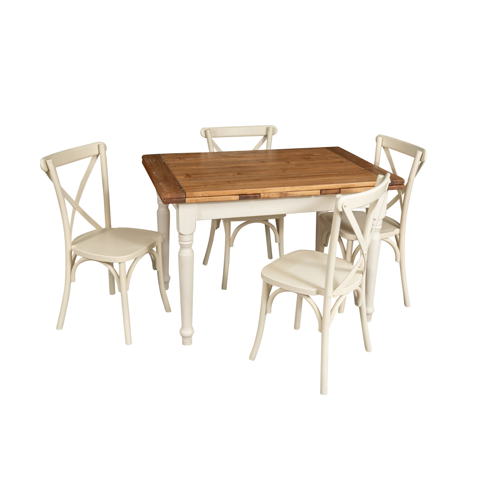 Tweekleurige tafel in massief lindehout met twee zijverlengingen die met elk rustiek decor gecombineerd kunnen worden.