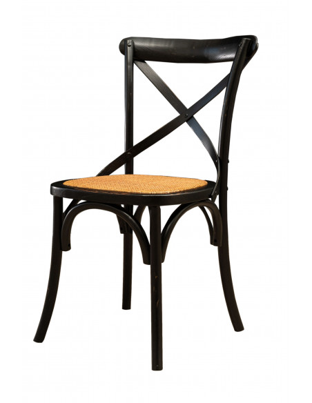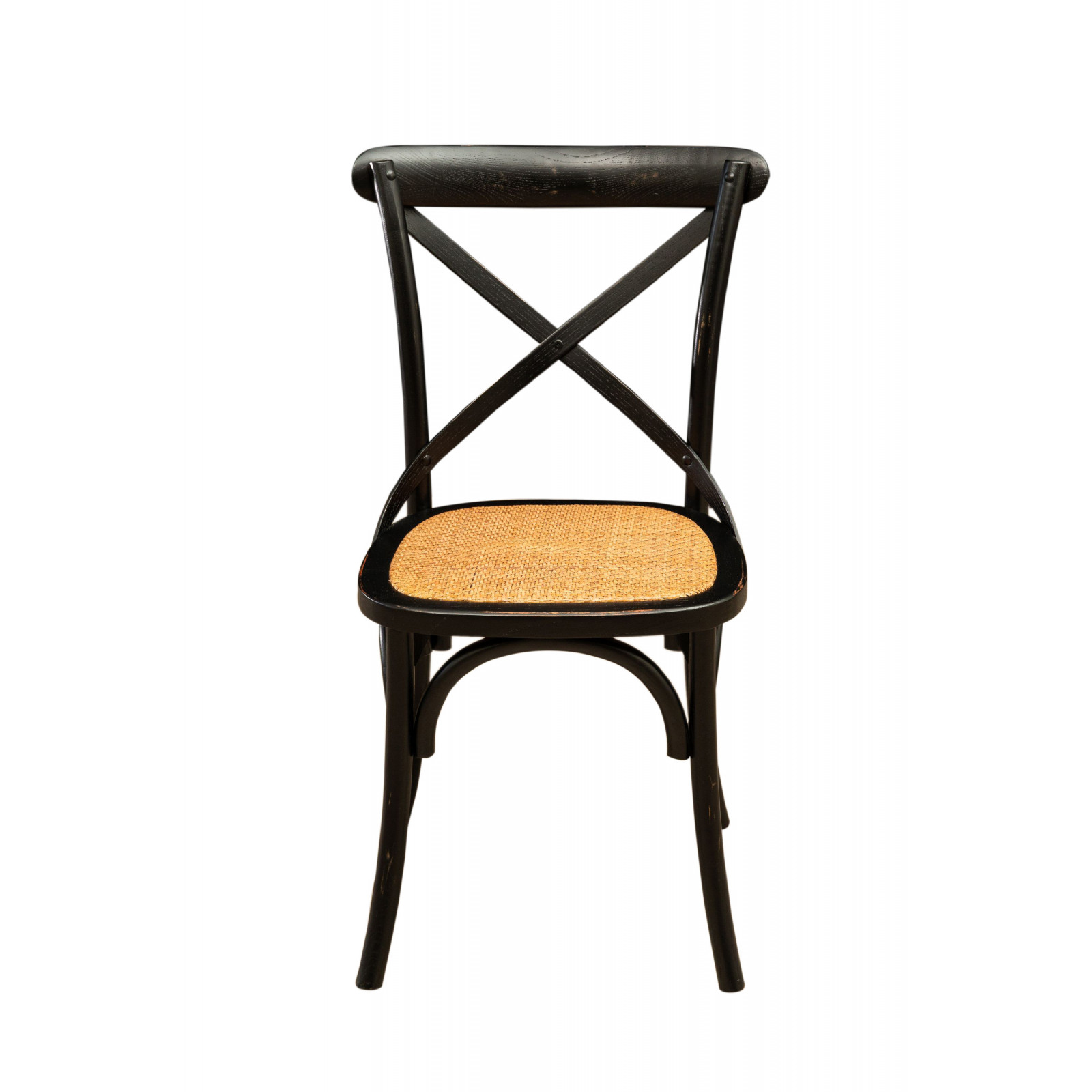 Stoel breedte 48 cm, diepte 52 cm, hoogte 88 cm in Thonet-stijl gemaakt van massief essenhout met gekruiste rugleuning en gevlochten rotan zitting. Dankzij het bistroontwerp is deze stoel ideaal voor het inrichten van elke kamer of ruimte in vintage stijl zonder aan comfort in te boeten.