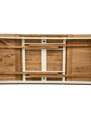 Landelijke uitschuifbare tafel in massief lindehout met verouderde witte structuur en natuurlijk blad L220xPR100xH80 cm. Gemaakt