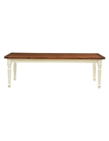 Landelijke uitschuifbare tafel in massief lindenhout, verouderde witte structuur met notenhouten blad L250xPR100xH80 cm. Gemaakt