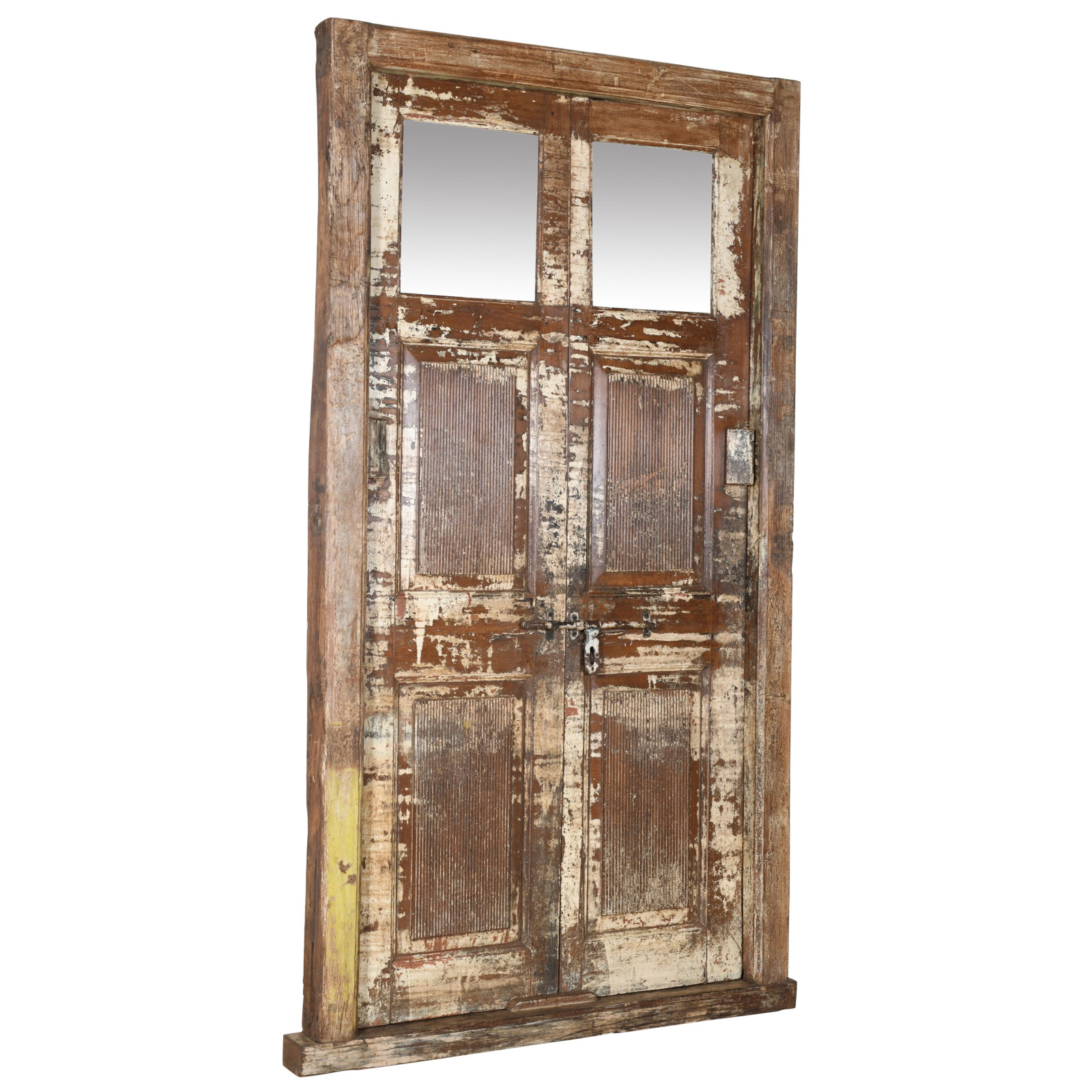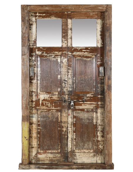 Starożytne drzwi/brama z litego drewna tekowego o wymiarach: długość 122 cm, głębokość 10 cm, wysokość 223 cm. Drzwi te pochodzą z rozbiórek i renowacji starych, ważnych budynków. Starannie odrestaurowane i przystosowane również do użytku na zewnątrz, każde drzwi są prawdziwym i niepowtarzalnym zabytkiem. Wszystkie wymiary odnoszą się do maksymalnych gabarytów produktu.