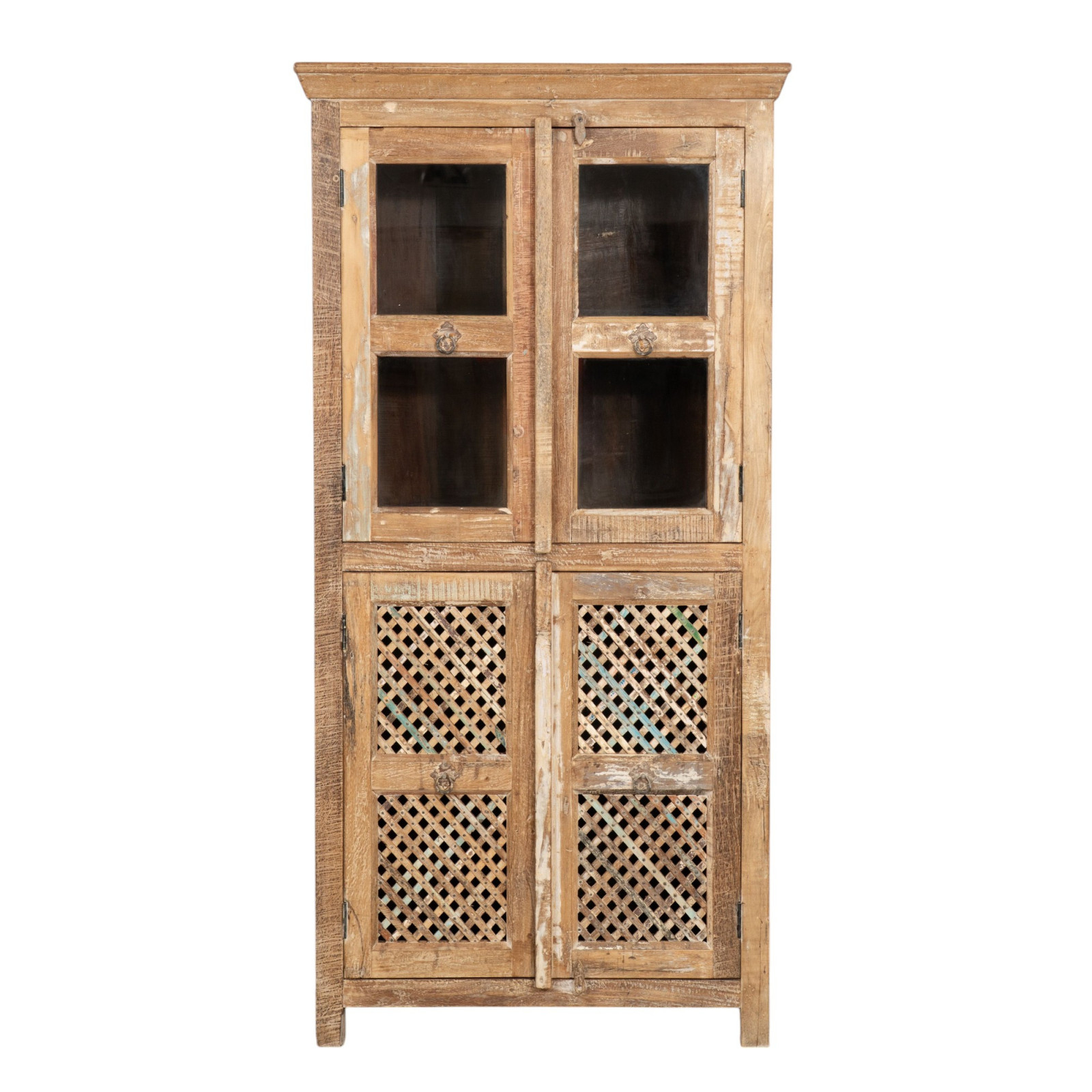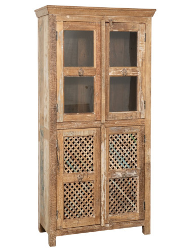 Witryna wykonana z litego drewna pochodzącego z recyklingu o wymiarach: szerokość 91 cm, głębokość 41 cm, wysokość 183 cm. Ręcznie malowana naturalnymi farbami, dzięki wielu odcieniom mebel ten jest wyjątkowy. Solidny i funkcjonalny, idealny dla miłośników antycznych mebli i drewna.