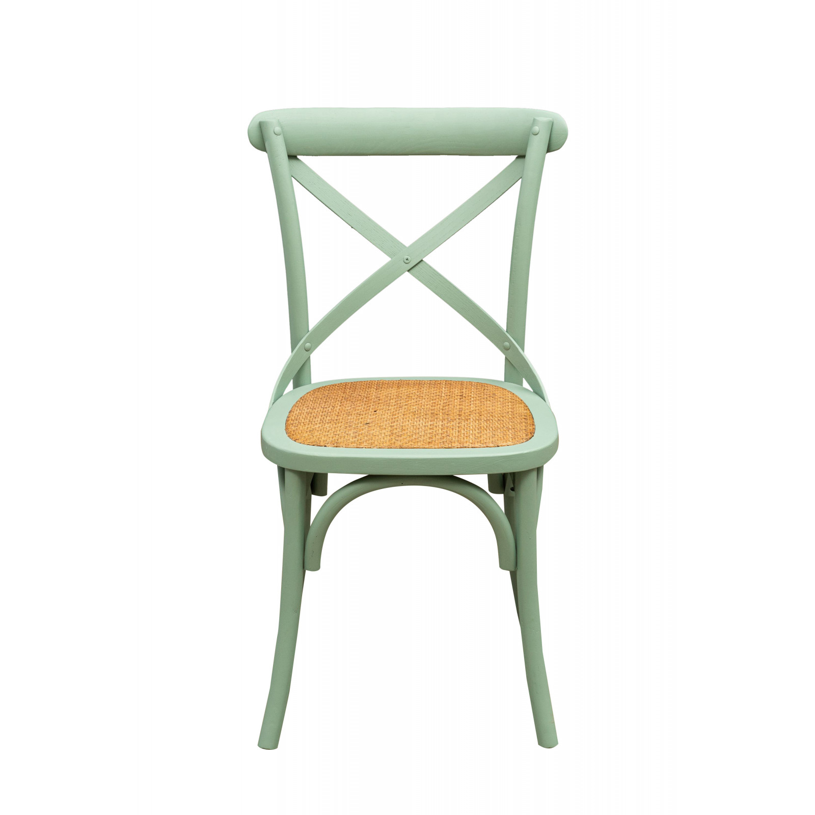 Krzesło o szerokości 48 cm, głębokości 52 cm, wysokości 88 cm w stylu Thoneta, wykonane z litego jesionu, ze skrzyżowanym oparciem i siedziskiem z tkanego włókna rattanowego. Dzięki swojej konstrukcji bistro idealnie nadają się do dekoracji każdego otoczenia lub pomieszczenia w stylu vintage, bez utraty komfortu.