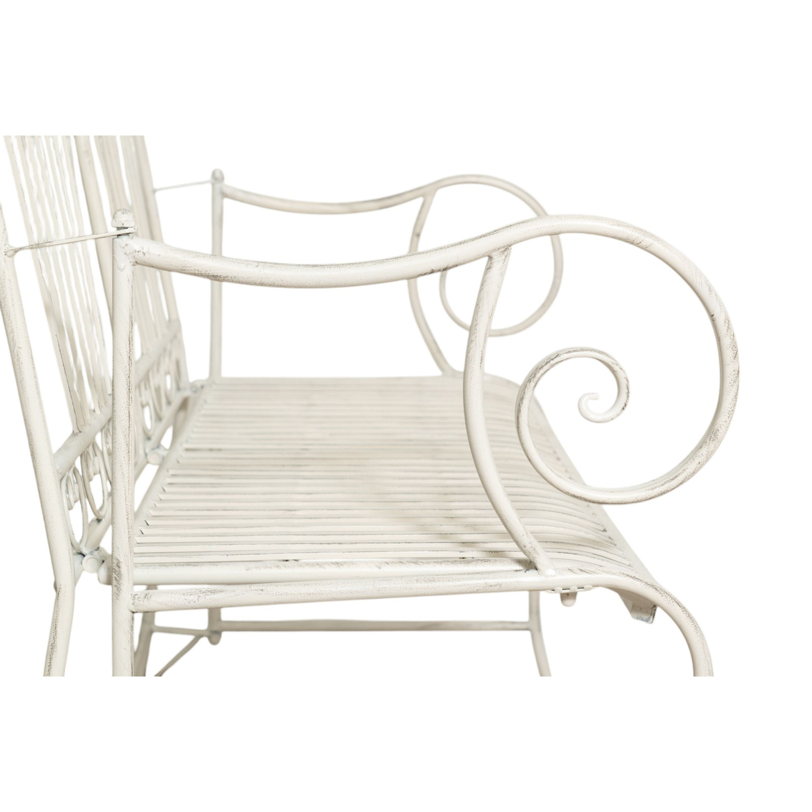 Ławki wykonane z żelaza o wymiarach: szerokość 113 cm, głębokość 58 cm, wysokość 94 cm, wykończenie w kolorze postarzanego bieli. Dzięki prowansalskiemu stylowi nadają one funkcjonalnej elegancji każdemu pomieszczeniu, zarówno wewnątrz, jak i na zewnątrz.