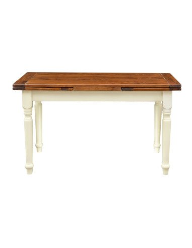 Stół rozkładany z litego drewna lipowego z postarzaną białą strukturą i blatem z orzecha włoskiego. Wyprodukowano we Włoszech