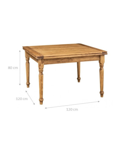 Rozsuwany kwadratowy stó? wykonany z litego drewna lipowego, wymiary L120xPR120xH80 cm, z mo?liwo?ci? przed?u?enia do 240 cm dzi?ki praktycznemu otwieraniu ksi??ki. Skrupulatna produkcja Made in Italy gwarantuje jako??, solidno??, funkcjonalno?? i wiejski styl, odpowiedni dla ka?dego ?rodowiska.