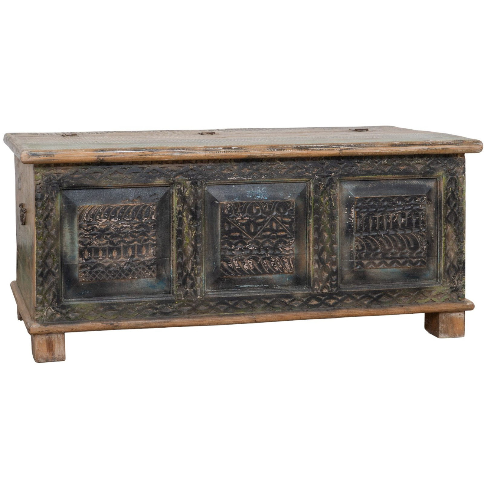Skrzynia wykonana z litego drewna pochodzącego z recyklingu o wymiarach: szerokość 123 cm, głębokość 52 cm, wysokość 54 cm. Solidna i funkcjonalna, idealna dla miłośników antycznych mebli i drewna. Każdy mebel jest unikatowy.