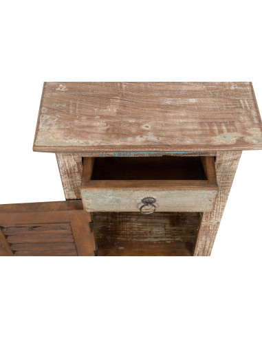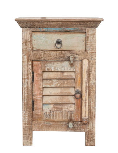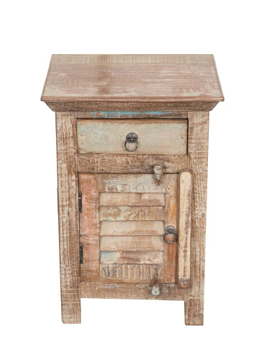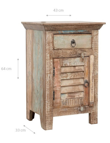 Szafka nocna wykonana z odzyskanego litego drewna o wymiarach szerokość 43 cm, głębokość 33 cm, wysokość 64 cm. Ręcznie malowana naturalnymi lakierami, wiele odcieni sprawia, że każdy mebel jest niepowtarzalny. Solidny i funkcjonalny, jest idealny dla miłośników zabytkowych mebli i drewna.