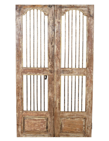 Starożytne drzwi/brama z litego drewna tekowego o wymiarach: długość 110 cm, głębokość 3 cm, wysokość 190 cm. Drzwi te pochodzą z rozbiórek i renowacji starych, ważnych budynków. Starannie odrestaurowane i przystosowane również do użytku na zewnątrz, każde drzwi są prawdziwym i niepowtarzalnym zabytkiem. Wszystkie wymiary odnoszą się do maksymalnych gabarytów produktu.