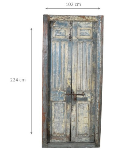 Starożytne drzwi/brama z litego drewna tekowego o wymiarach: długość 102 cm, głębokość 12 cm, wysokość 224 cm. Drzwi te pochodzą z rozbiórek i renowacji starych, ważnych budynków. Starannie odrestaurowane i przystosowane również do użytku na zewnątrz, każde drzwi są prawdziwym i niepowtarzalnym zabytkiem. Wszystkie wymiary odnoszą się do maksymalnych gabarytów produktu.