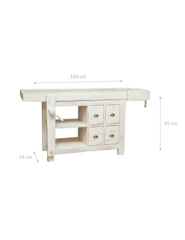 Wiejski stół warsztatowy z litego drewna lipowego z antycznym białym wykończeniem L184xPR74xH92 cm. Wyprodukowano we Włoszech