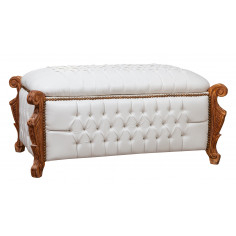 Baú estilo Luís XVI francês, em madeira maciça de faia, entalhada e acabada à mão com pátina folheada a ouro, dimensões: largura 115 cm, profundidade 66 cm, altura 60 cm. Assento acolchoado feito à mão.Todas as medidas referem-se ao tamanho máximo do item.