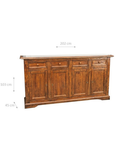Totalmente fabricado em madeira maciça de linden tamanho L202xPR45xH103 cm. Quatro grandes prateleiras fechadas por duas portas duplas, quatro gavetas práticas feitas de barris engolidos e botões de madeira combinados com solidez, o resultado do artesanal meticuloso Made in Italy, torná-lo ideal para completar qualquer ambiente.