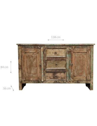 Cupboard sólido e versátil feito de madeira de recuperação sólida. Pintados à mão com pinturas naturais, as muitas sombras fazem cada mobiliário uma peça única. Tem grandes pisos fechados com portas e 3 gavetas centrais. Tamanho L138xPR36xH84 cm, cabe facilmente em qualquer ambiente. Ideal para os amantes de móveis antigos e madeira.