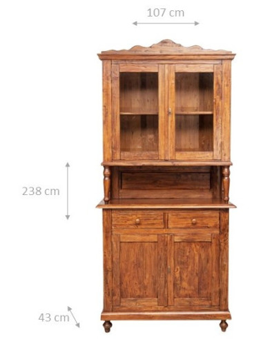 Double-body vitrine sideboard, inteiramente feito de madeira de cal sólida. Tamanho 107 cm de largura, profundidade 43 cm, altura 238 cm, apresenta um design que lembra um estilo antigo nunca passado moda. Consiste em uma base de 2 portas e 2 janelas superiores, duas gavetas feitas com recessos de cauda de andorinha e botões de madeira e um grande como suporte central confortável. Solidez e durabilidade são garantidas por artesanato meticuloso Made in Italy.