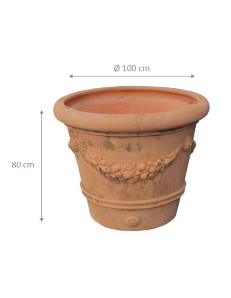 Conca festonata envelhecido, feito à mão com argila toscana, tamanho 100 cm, altura 80 cm. A realização e a culinária seguem as antigas tradições toscanas. Qualidade do solo e sistema de cozinha tornam o conca resistente à geada. O processamento totalmente feito à mão torna cada item uma peça única.