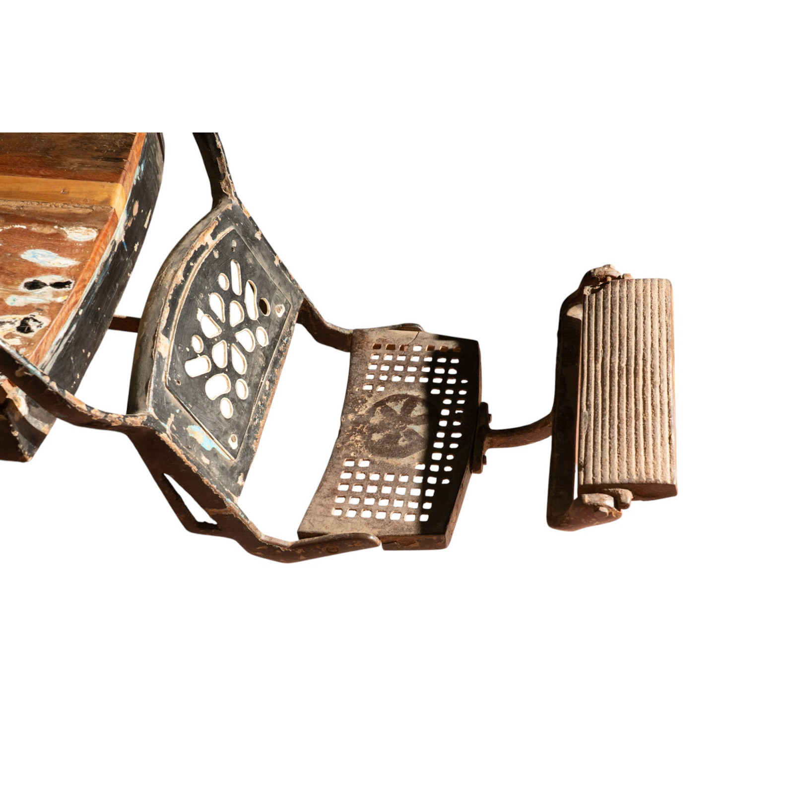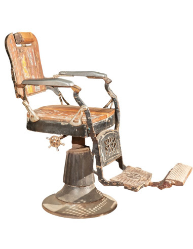 Antiga cadeira de barbeiro com 78 cm de comprimento, 56 cm de profundidade e 113 cm de altura. Esta cadeira é uma cadeira original do século XIX, finamente restaurada em ferro e ferro fundido, com assento e encosto revestidos em madeira.