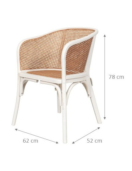 Cadeiras em madeira maciça com 62 cm de largura, 52 cm de profundidade e 78 cm de altura. A poltrona possui um assento em rattan e um encosto artesanal em palhinha vienense.