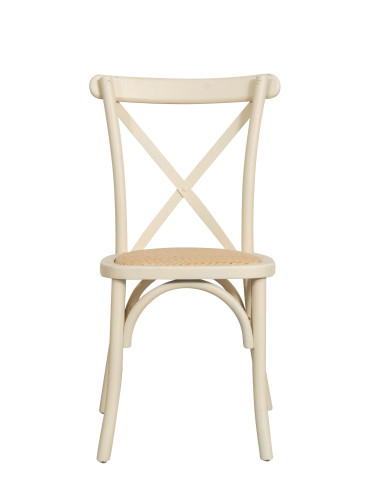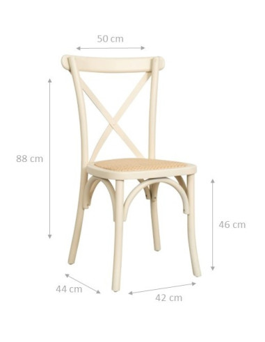 Cadeira com as dimensões de largura 42 cm, profundidade 44 cm, altura 88 cm em estilo Thonet feita de freixo maciço com encosto cruzado. Graças ao seu design de bistrô, é ideal para mobilar qualquer sala ou local em estilo vintage, sem sacrificar o conforto. A altura do chão ao assento é de 46 cm.