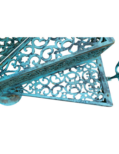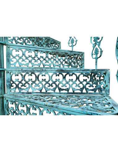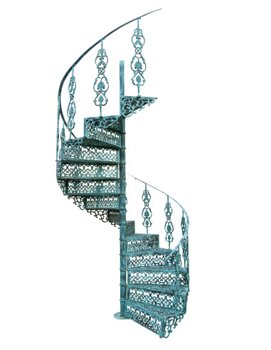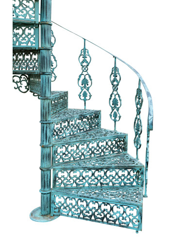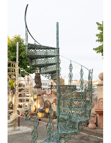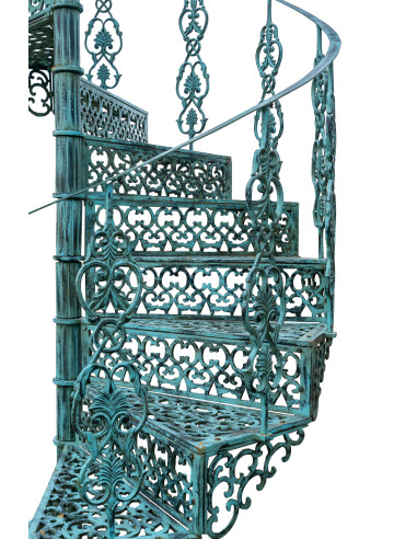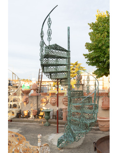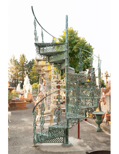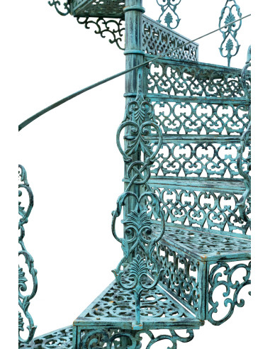 Escada em caracol em ferro fundido muito estável, robusta e pesada com dimensões largura total 204 cm, largura do degrau 92 cm, profundidade 100 cm, altura do último degrau 300 cm, altura total 400 cm, com acabamento preciso totalmente feito à mão, obtendo um efeito verdadeiramente antigo. Por se tratarem de acabamentos artesanais, o acabamento pode não corresponder fielmente às fotografias, apresentando também peças de ferrugem natural que tornam cada peça numa peça única.