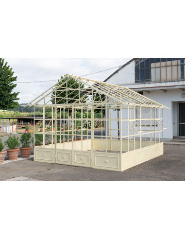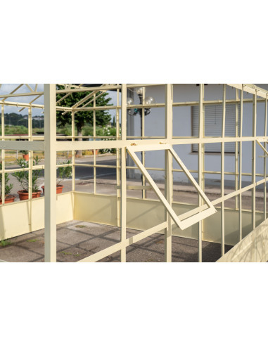 Estufa muito sólida e estável feita de ferro tubular robusto com 350 cm de largura, 400 cm de profundidade e 296 cm de altura, com acabamento antigo, com partes riscadas e propositadamente descascadas para lhe dar um aspeto de vida. Esta estufa não necessita de qualquer tipo de autorização municipal para ser instalada. Todas as medidas referem-se às dimensões totais máximas do artigo.