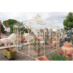 Gazebo muito sólido e estável em ferro tubular robusto com dimensões de 400 cm de largura, 400 cm de profundidade, 365 cm de altura, acabamento antiquado com partes riscadas e propositadamente descascadas para dar um aspeto de vida. Este gazebo não necessita de licença municipal para ser instalado. Todas as medidas referem-se às dimensões totais máximas...