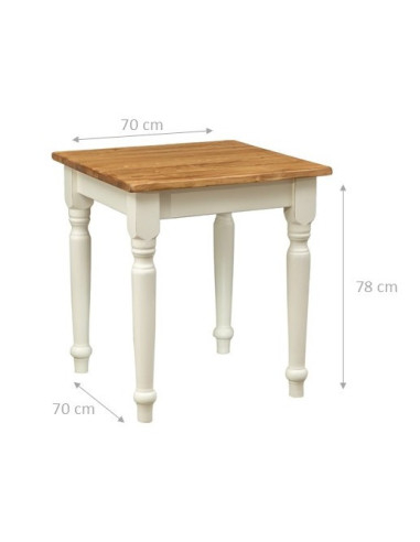 Mesa quadrada inteiramente em madeira maciça. Qualidade estética e solidez ao longo do tempo são garantidas pela habilidade cuidadosa Made in Italy. O contraste cromático entre a estrutura branca e o plano natural dá um charme de estilo de país ideal para completar qualquer ambiente. Medidas: comprimento 70 cm de profundidade 70 cm de altura 78 cm.