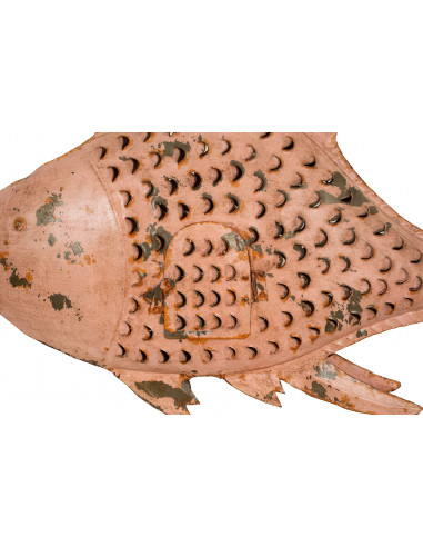 Lanterna original em forma de peixe feita de ferro forjado pintado à mão com efeito antigo, medindo 95 cm de largura, 20 cm de profundidade e 50 cm de altura. Está equipado com uma portinha lateral para inserção da vela e uma corrente para fixação no teto, embora graças às aletas também possa ser colocado sobre qualquer superfície plana. Muitas vezes também usado como lustre devido à facilidade de eletrificação. Sendo peças únicas, feitas à mão, as tonalidades das cores podem variar ligeiramente entre si.