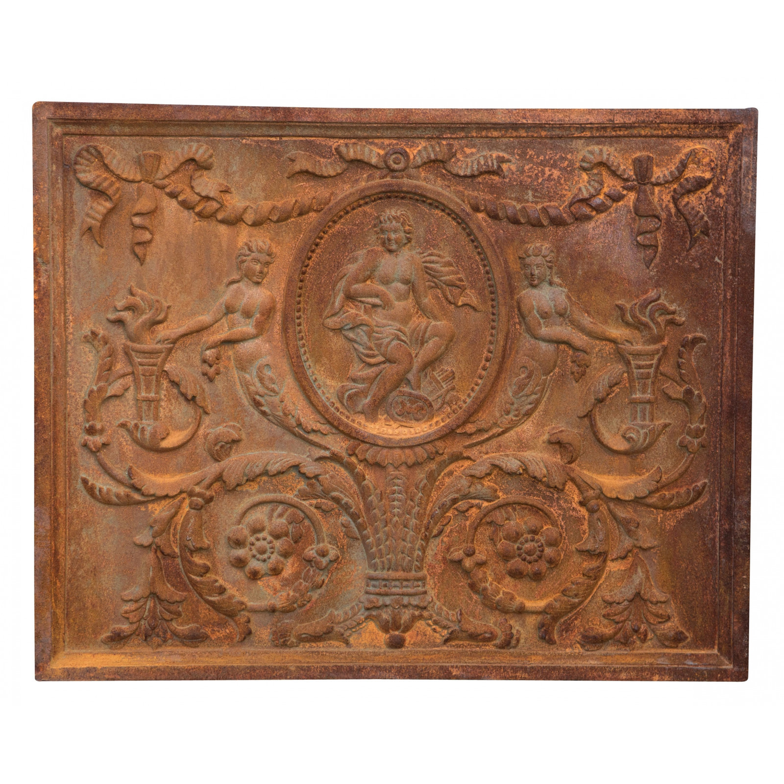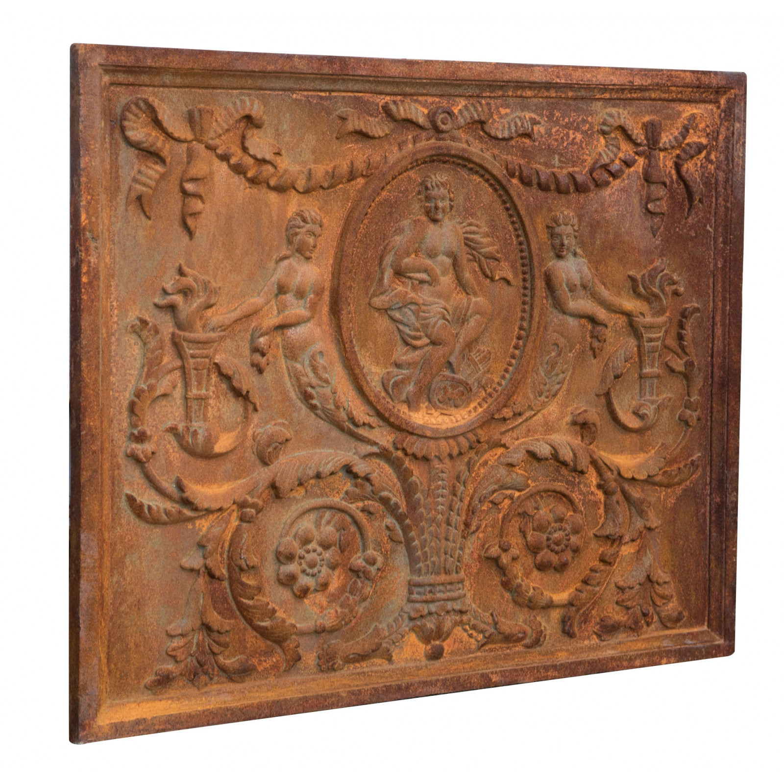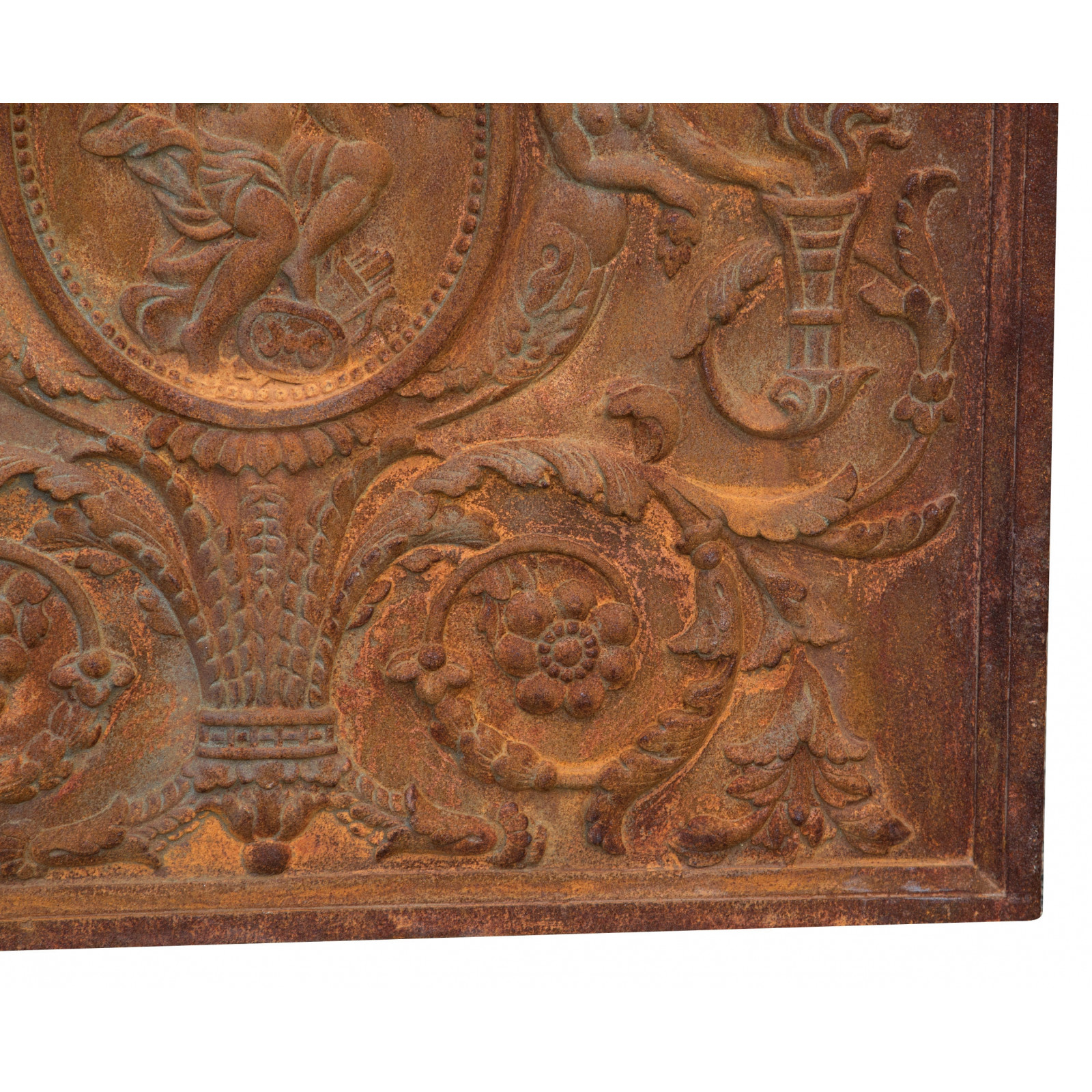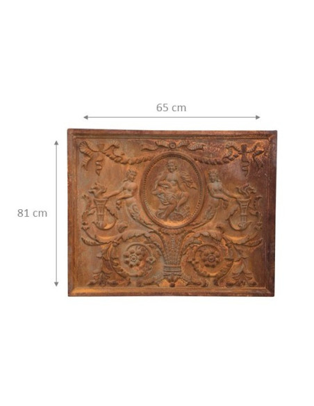 Placa para lareira em ferro fundido decorada em relevo, com dimensões L65XPR2XH81 cm. Além de armazenar e irradiar calor antes e depois de apagar o fogo, é também um complemento de decoração original. Por se tratar de acabamentos artesanais, o acabamento pode não corresponder fielmente às fotografias, apresentando também partes com ferrugem natural, tornando cada artigo uma peça única.