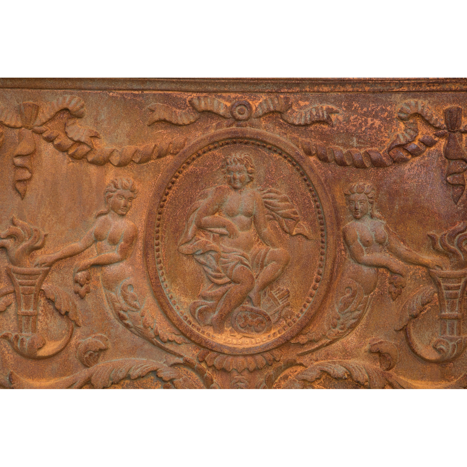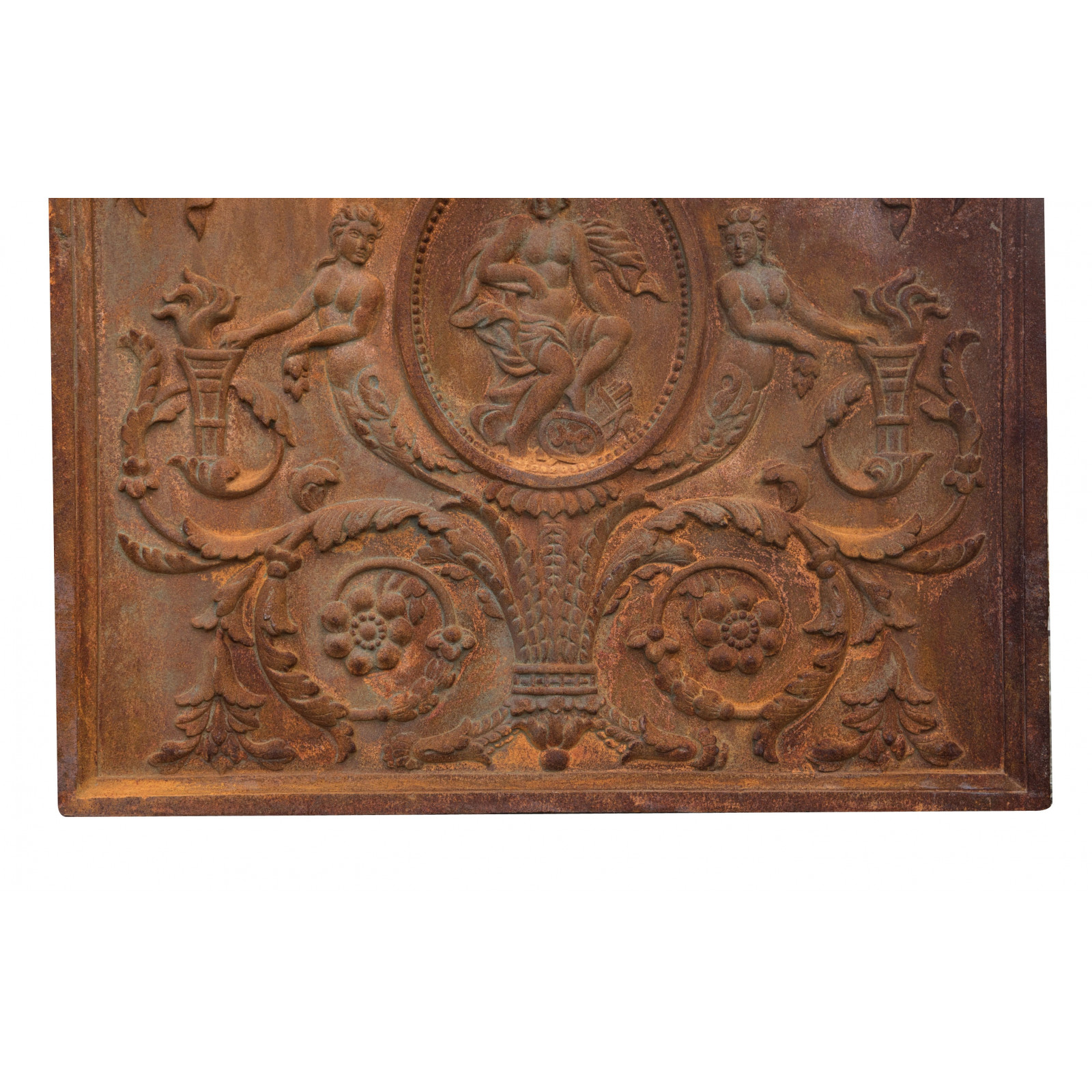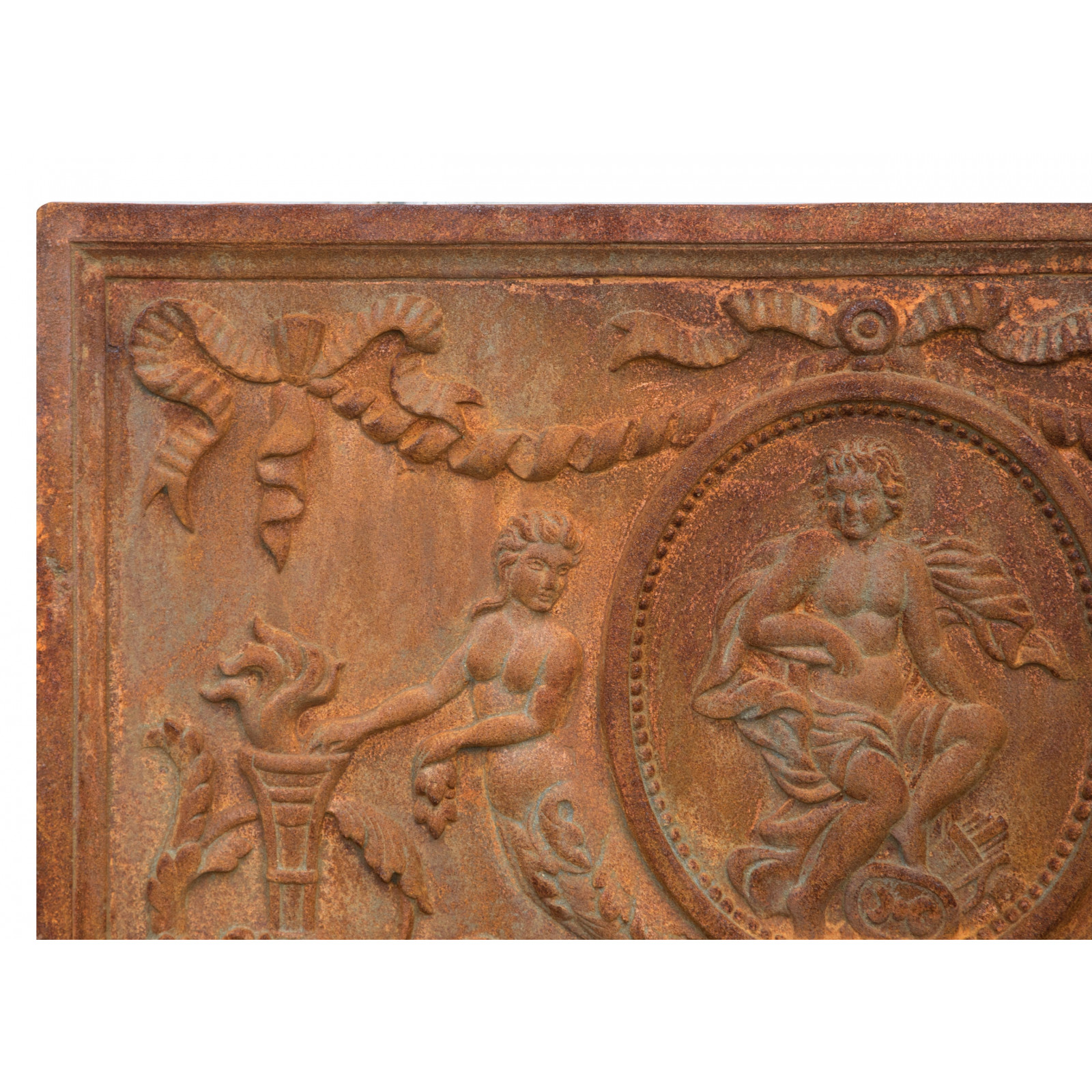 Placa para lareira em ferro fundido decorada em relevo, com dimensões L65XPR2XH81 cm. Além de armazenar e irradiar calor antes e depois de apagar o fogo, é também um complemento de decoração original. Por se tratar de acabamentos artesanais, o acabamento pode não corresponder fielmente às fotografias, apresentando também partes com ferrugem natural, tornando cada artigo uma peça única.