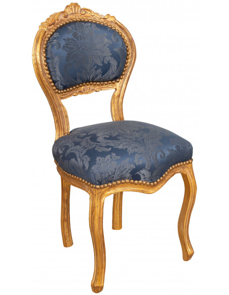 Poltrona de Luís XVI, em madeira maciça de faia, esculpida e terminada à mão com pátina de folha de ouro de 42 cm, profundidade 45 cm, altura 90 cm. Banco artificialmente acolchoado. Todas as medidas referem-se ao tamanho máximo do item. |