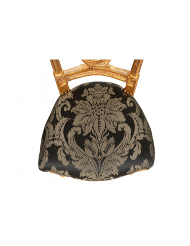 | Poltrona francesa estilo Luís XVI, em madeira maciça de faia, entalhada e acabada à mão com pátina folheada a ouro, medindo 40 cm de comprimento, 46 cm de profundidade, 92 cm de altura. Assento acolchoado feito à mão. Todas as medidas referem-se ao tamanho máximo do item. |
