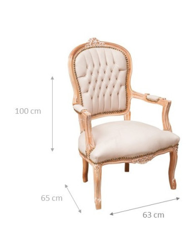 Poltrona francesa estilo Luís XVI, em madeira maciça de faia, entalhada à mão, largura 63 cm, profundidade 65 cm, altura 100 cm. Acabamento tratado natural, branco Shabby levemente patinado. Assento e encosto acolchoados feitos à mão.