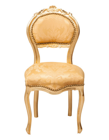 Cadeira com apoio para os pés estilo Luís XVI francês, em madeira maciça de faia, esculpida e acabada à mão com pátina folheada a ouro, dimensões: largura 42 cm, profundidade 45 cm, altura 90 cm. Assento acolchoado feito à mão.