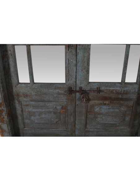 Porta de madeira maciça e ferro para interior ou exterior, antiga e medieval, com moldura e vidro