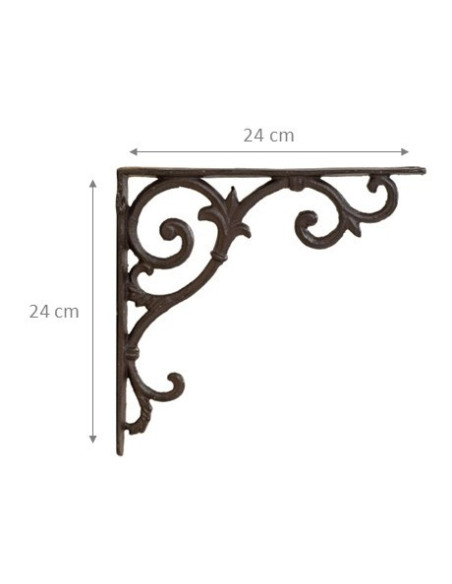 Suporte de prateleira de parede muito sólido e resistente para pendurar em ferro fundido medindo 24 cm de largura, 4 cm de profundidade, 24 cm de altura com um acabamento preciso totalmente feito à mão, obtendo um verdadeiro efeito antigo. Graças à sua decoração, a sua funcionalidade alia-se à elegância para completar qualquer ambiente.