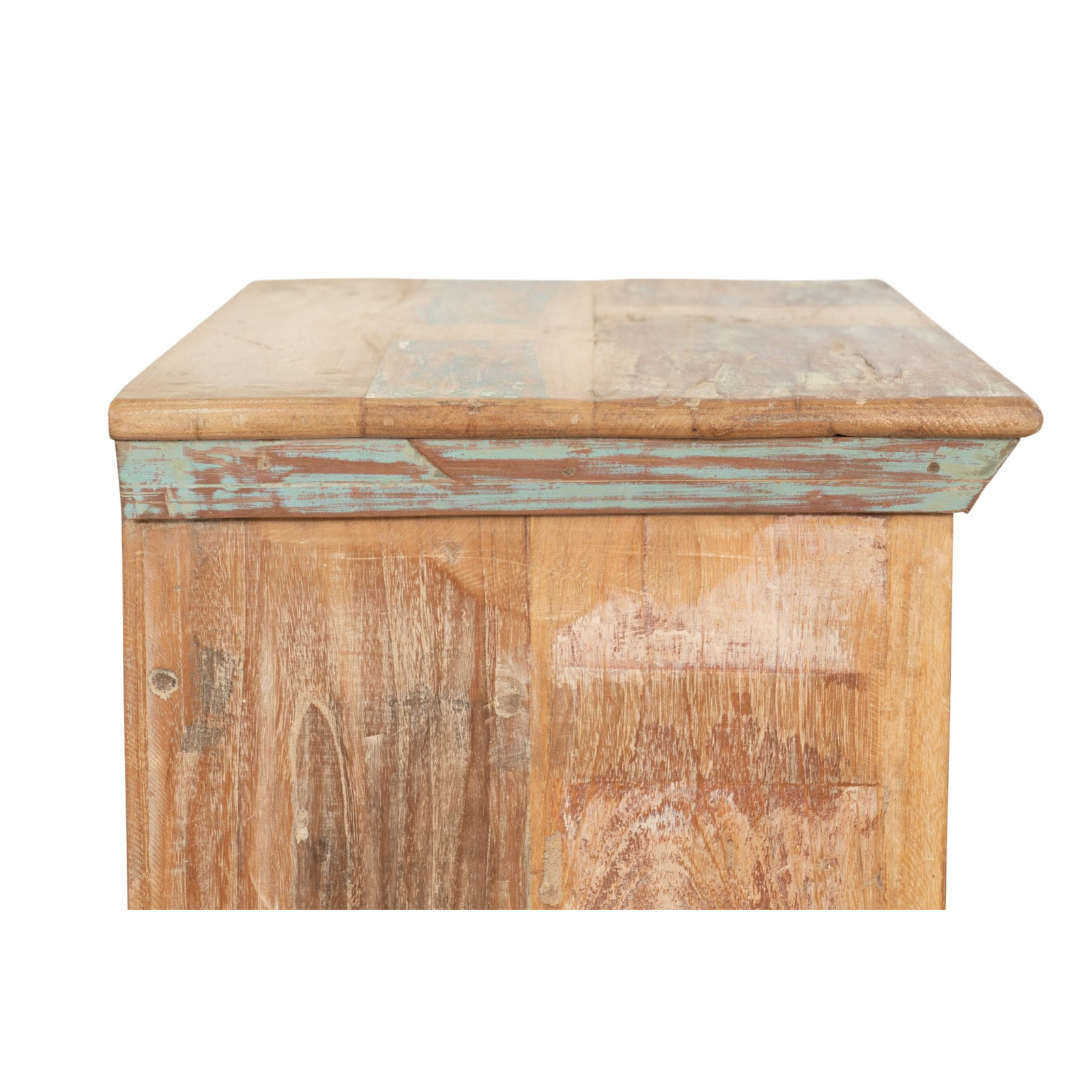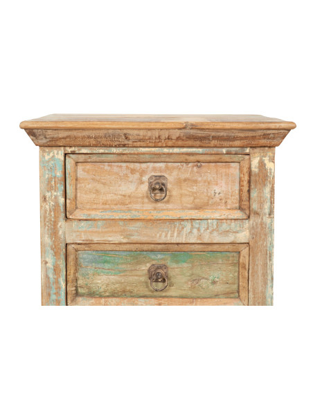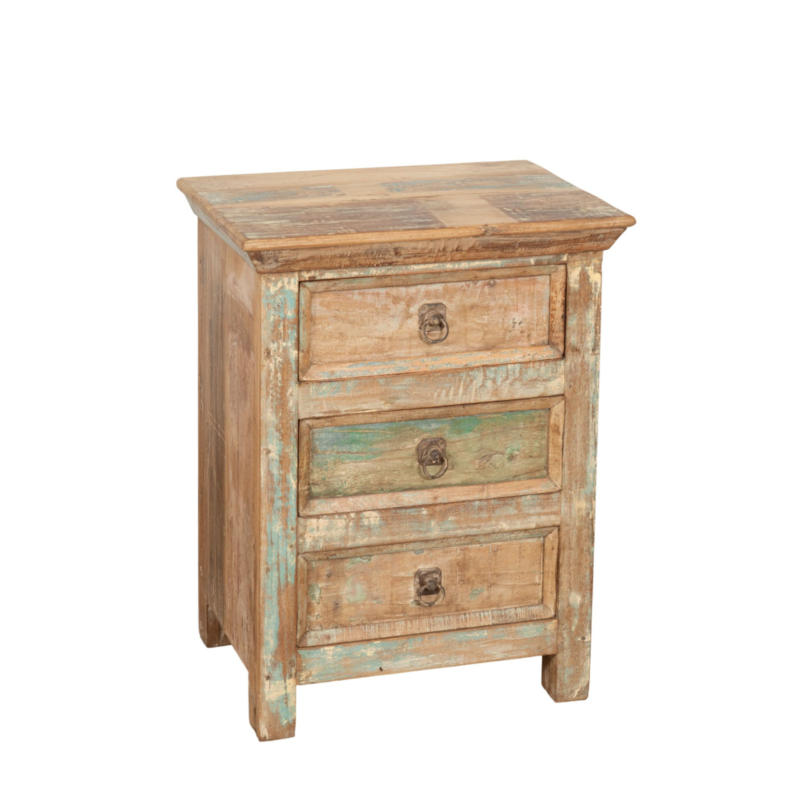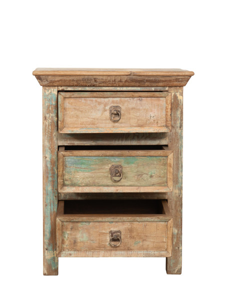 Cômoda com 3 gavetas feita em madeira maciça recuperada com dimensões de largura 55 cm, profundidade 38 cm, altura 71 cm. Pintada à mão com vernizes naturais, as múltiplas tonalidades tornam cada móvel uma peça única. Sólida e funcional, é ideal para os amantes de móveis antigos e de madeira.