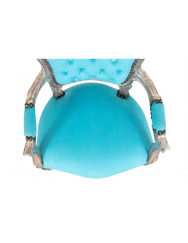 Scaun pentru copii în stil Ludovic al XVI-lea francez, din lemn masiv de fag, sculptat manual. Finisaj în foiță de argint antic, dimensiuni 51 cm lățime, 50 cm adâncime, 73 cm înălțime. Scaun și spătar tapițate manual în piele artificială.