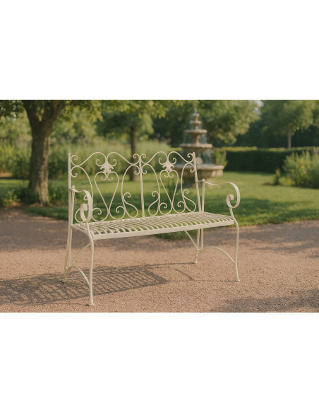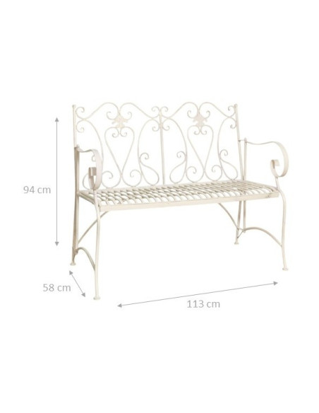 Bănci/canapele din fier, cu lățimea de 113 cm, adâncimea de 58 cm și înălțimea de 94 cm, cu finisaj alb antic. Cu stilul său provensal, mobilierul conferă eleganță funcțională oricărui spațiu, atât interior, cât și exterior.