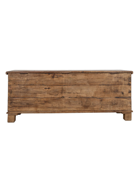 Cufăr din lemn masiv reciclat, cu dimensiunile de 140 cm lățime, 67 cm adâncime și 55 cm înălțime. Solid și funcțional, este ideal pentru iubitorii de mobilier antic și lemn. Fiecare piesă de mobilier este unică.