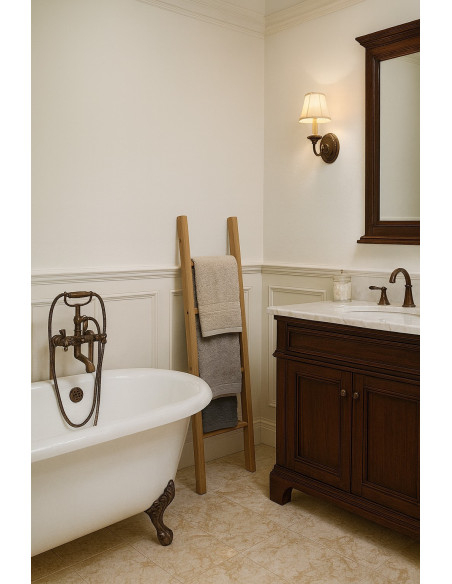 Scara din lemn pentru prosoape care reproduce fidel atât estetica, cât și construcția scărilor vechi. O piesă de mobilier foarte versatilă, precum și un instrument funcțional pentru viața de zi cu zi. Fiind realizată manual, fiecare scară poate diferi ușor de celelalte în ceea ce privește finisajul. Scara are o înălțime de 130 cm, o lățime de 35 cm și o adâncime de 4 cm.