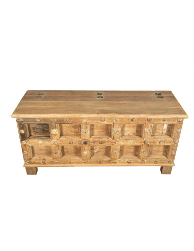 Piept, trunchi, bancă, recipient, cutie, original antic în lemn de tec sculptat cu finisaj decapat