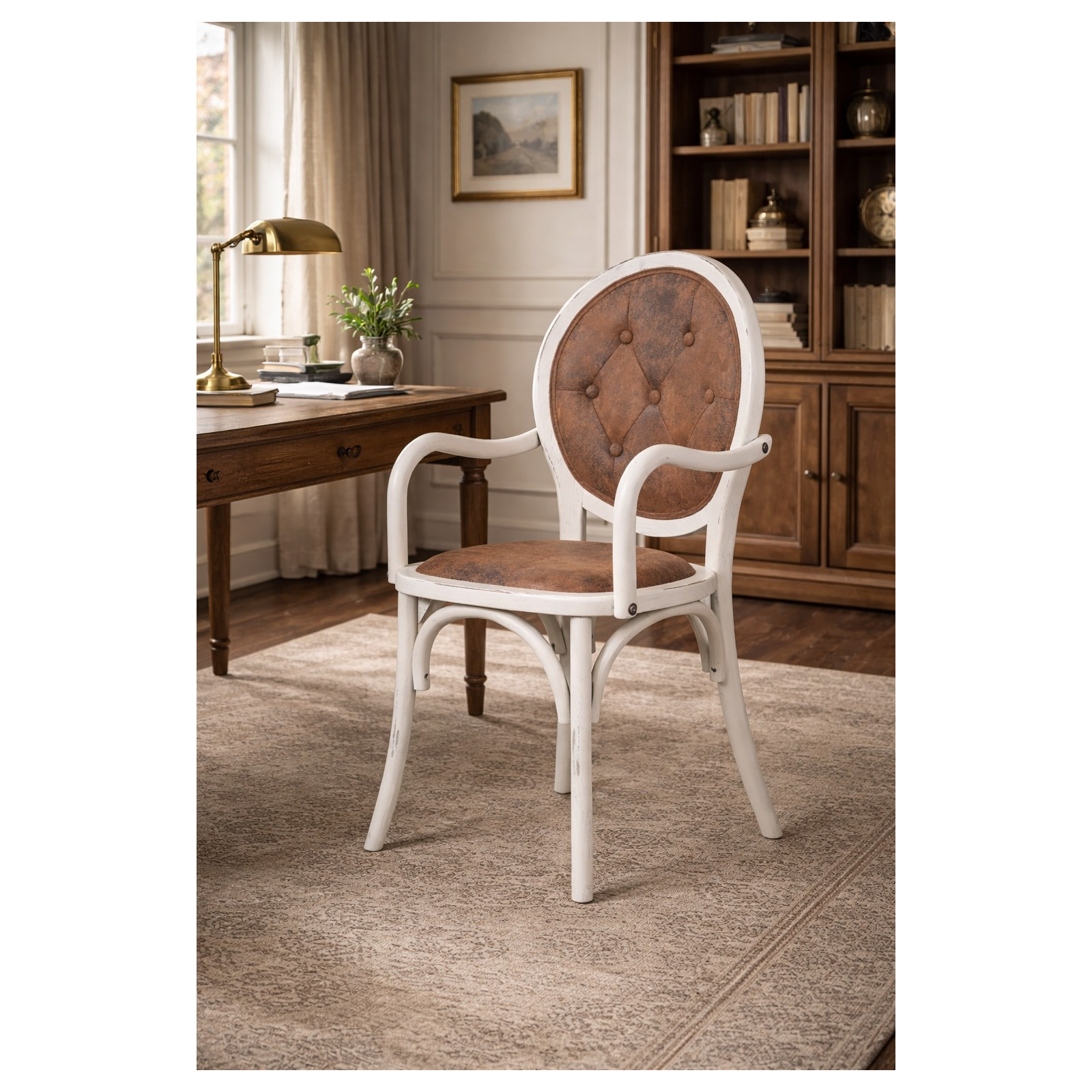 Scaun cu cotiere din lemn masiv și șezut căptușit, finisaj alb antic