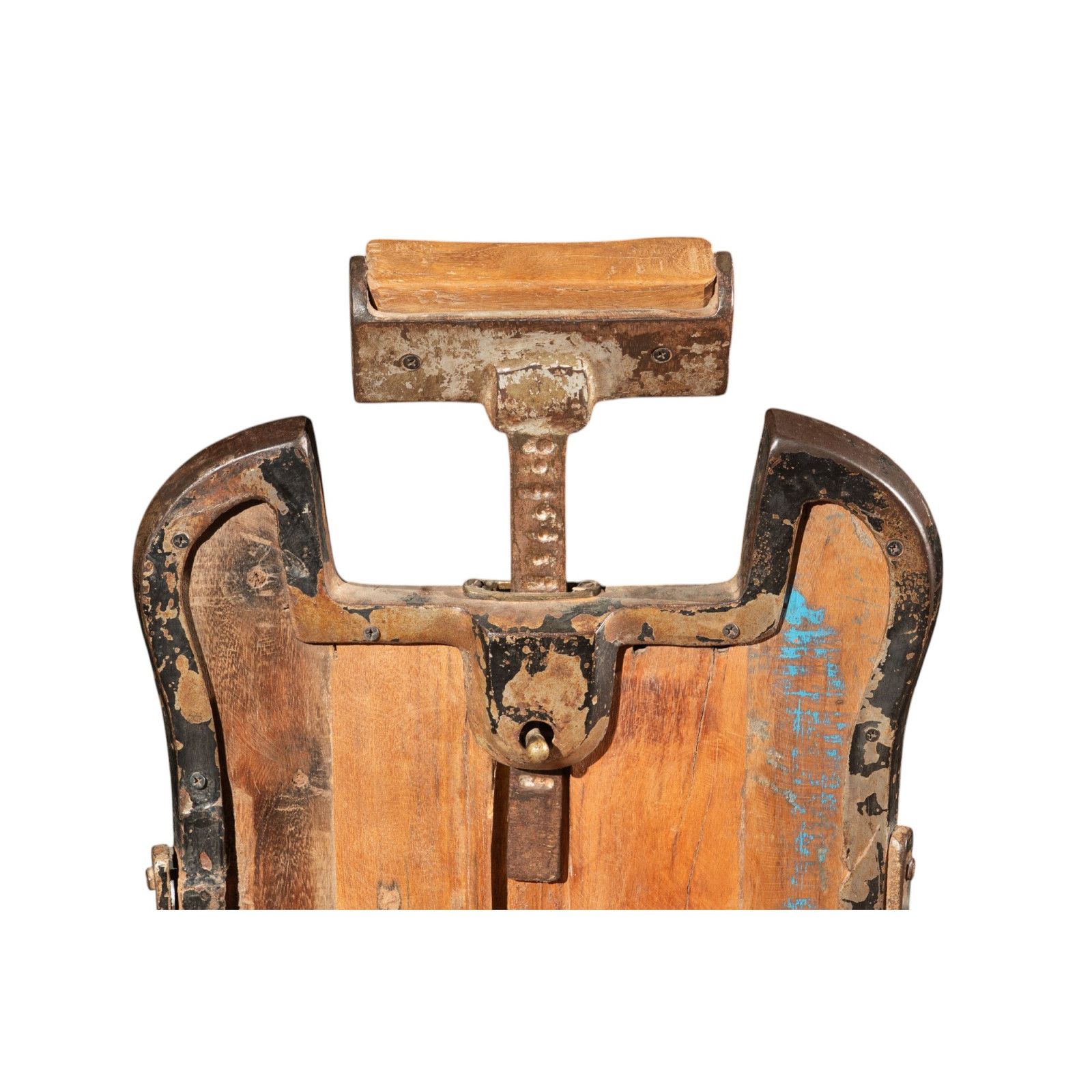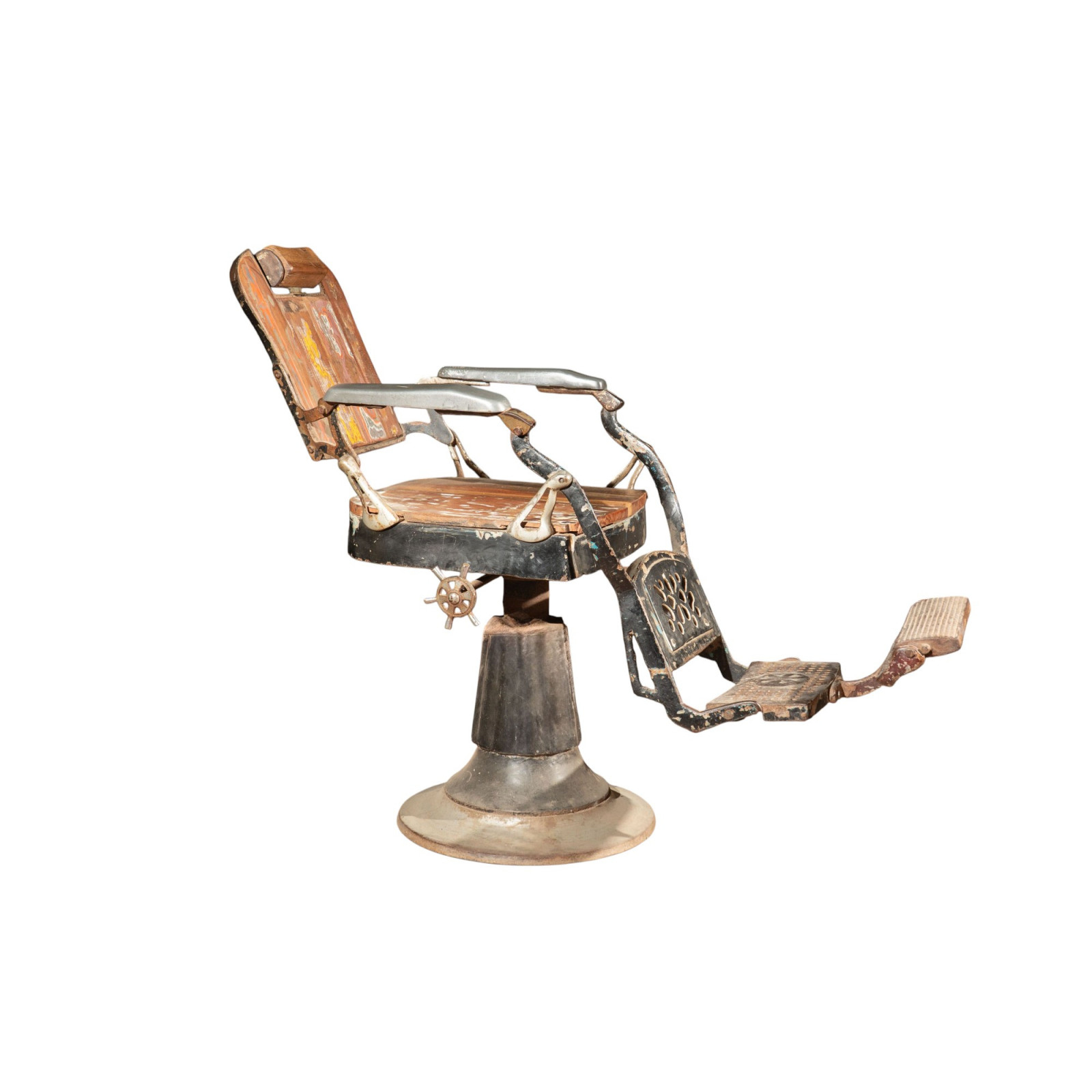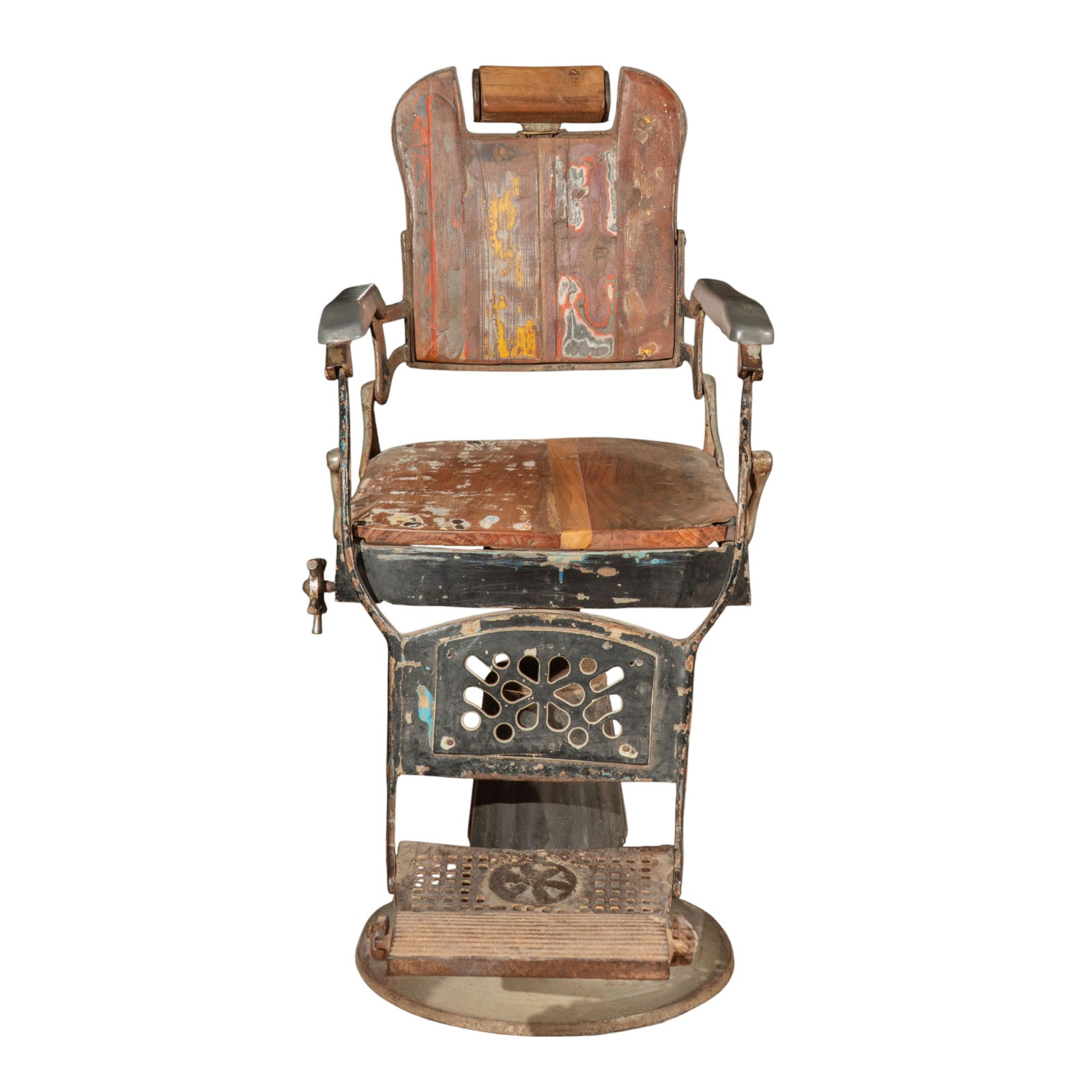 Scaun de frizerie antic cu lungimea de 78 cm, adâncimea de 56 cm și înălțimea de 113 cm. Acest scaun este un scaun original din secolul al XIX-lea, restaurat cu grijă, din fier și fontă, cu șezut și spătar din lemn.